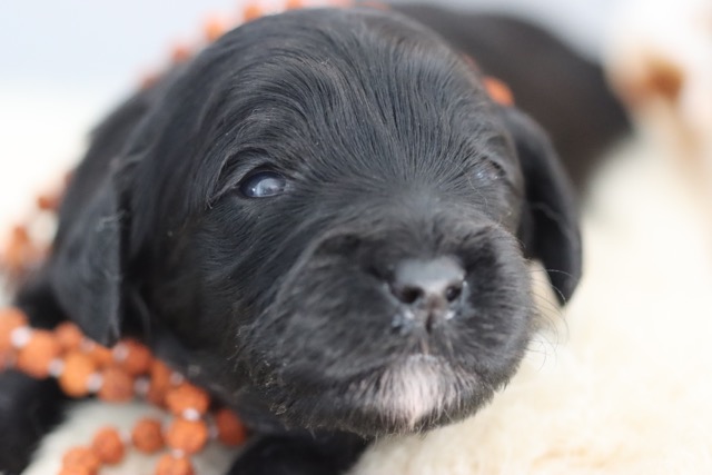 Lona is geboren uit een combinatie van Zari en Quinn. Zari was niet van mijn moeders zijde te wijken omdat ze terminaal was. Tot de laatste seconde waakte ze bij haar en toen ze eenmaal overleden was, was er tijd om te gaan bevallen. 4 uur na het overlijden van mijn lieve moeder kwam als eerste een mooi zwart meisje. We hadden hier zo op gehoopt en onze wens werd vervult. Ze bleek later ook de enige zwarte pup te zijn met bruine lokken. Ze is phantomdrager.